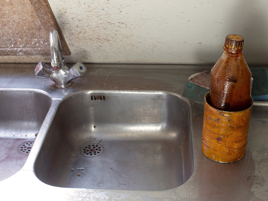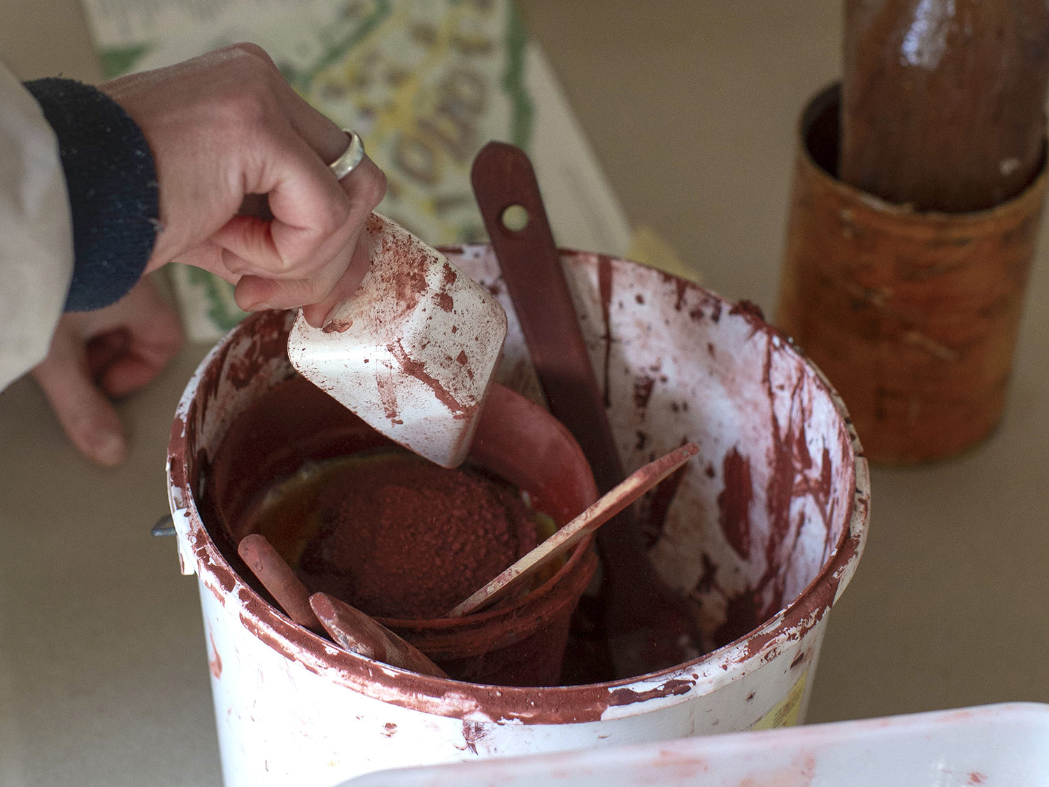 For today’s work, she has a couple of litres of milk lined up next to a bottle of linseed oil and a metal can labelled ‘Indian red’.