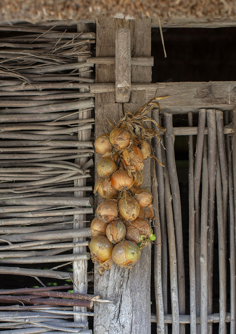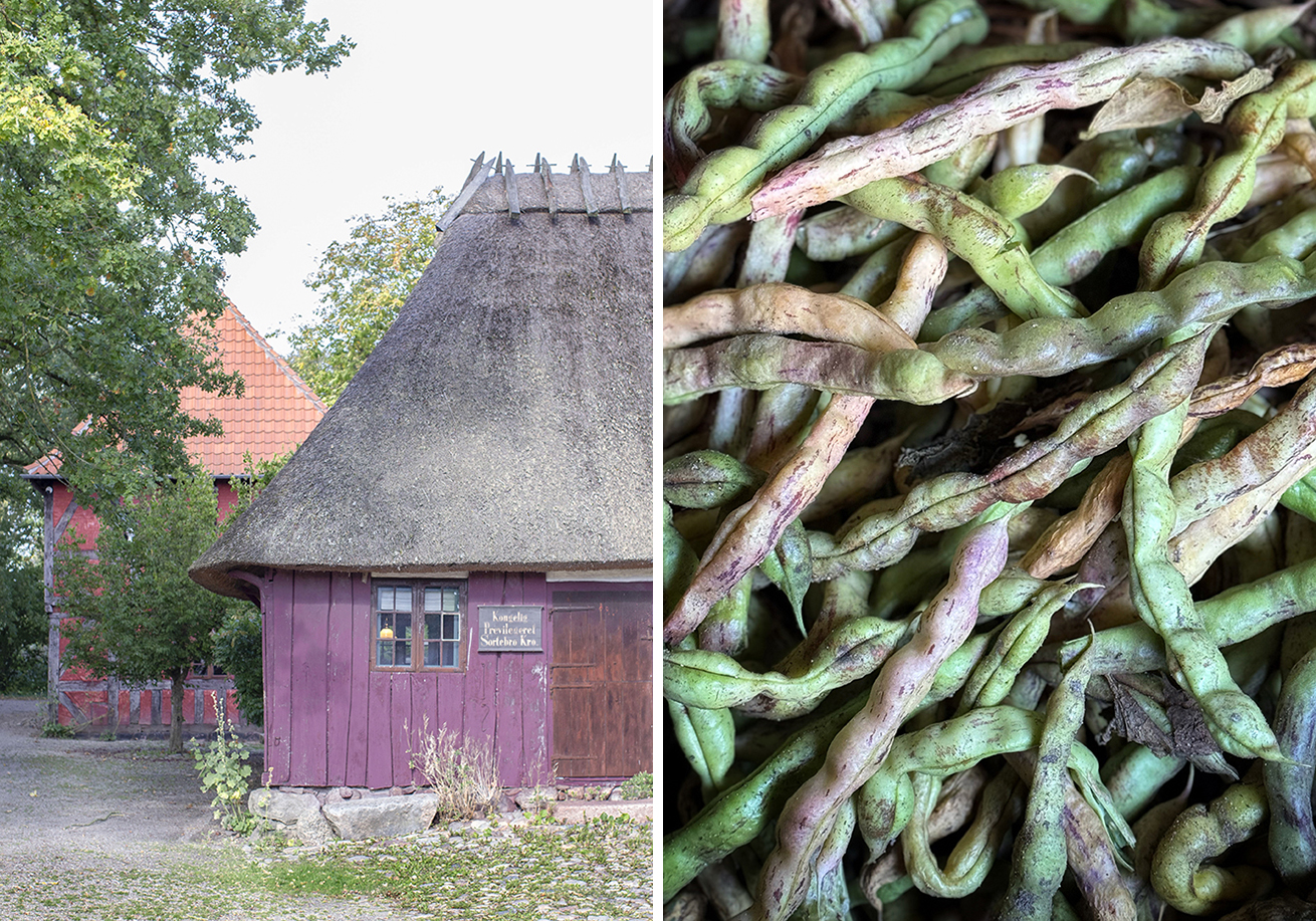 She continues painting, and I go exploring in between the buildings – finding onions hung up to dry here, a quince tree there, and on my way out, I pass the taproom in the active country inn Sortebro Kro, which can be accessed from inside the museum village or from the street. It is buzzing with life, and the smell of home cooking wafts from an open window.