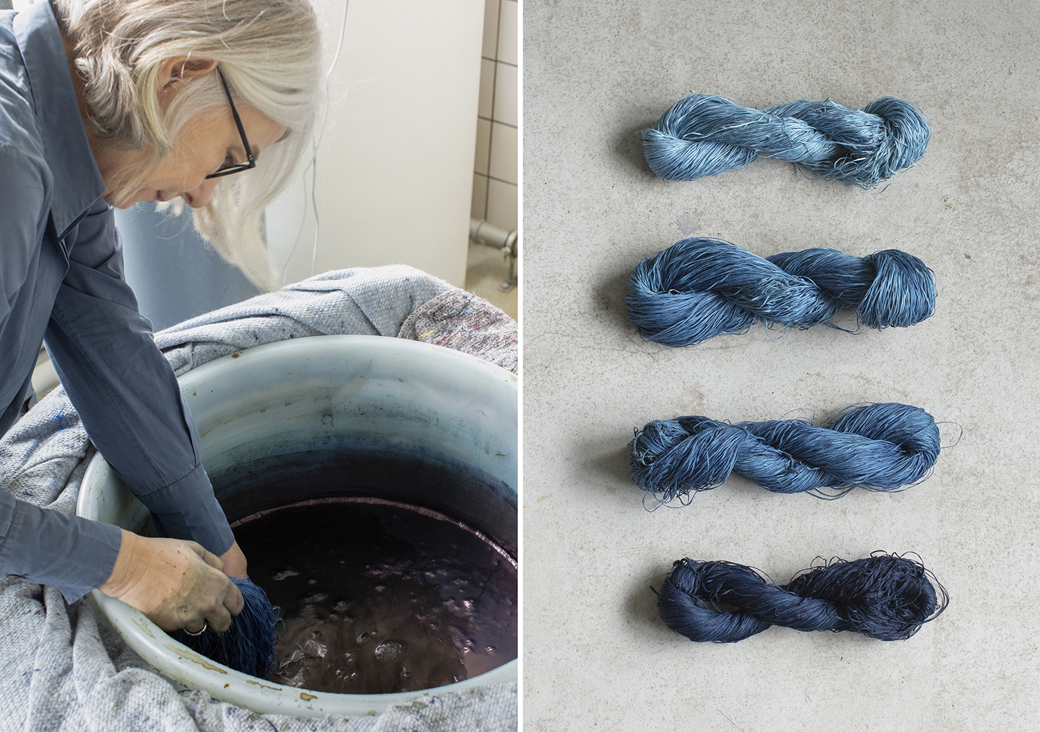 She works with dyeing, both in relation to her teaching practice and, very much, to her craft practice. Currently, she is working on a project titled ‘Atlas over himlens blå’ (Atlas of the blue of the sky).
