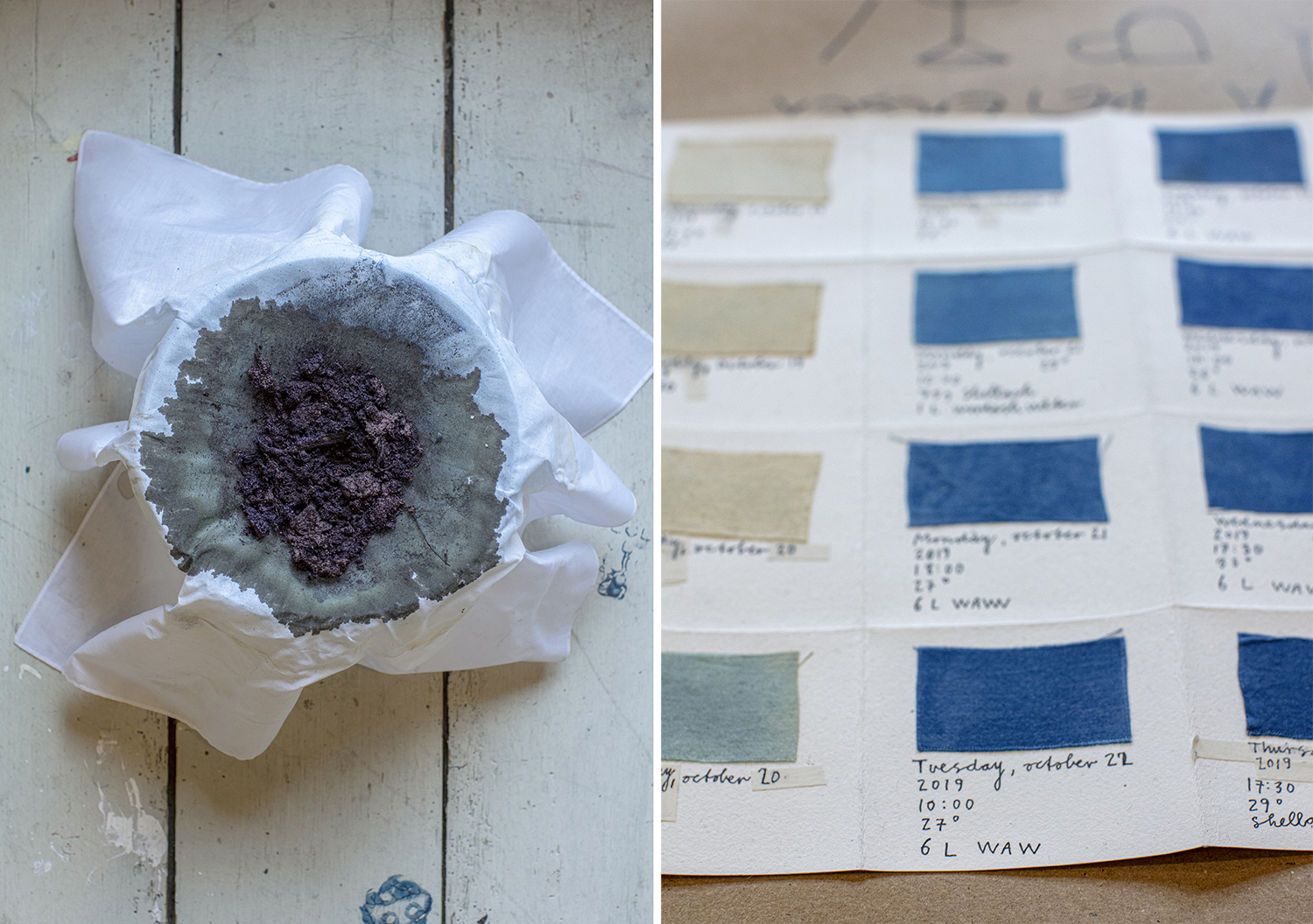 ‘I’m going to continue to work with woad rather than indigo. Woad is the natural choice in our part of the world. I have been introduced to new methods that I’m going to test, so that I can hopefully avoid the use of chemicals. I’m going to try moving past working exclusively with fresh woad, and I’m going to experiment with fermentation methods. In other words, I developed an even deeper love of the blue universe and renewed energy to continue my own project.’