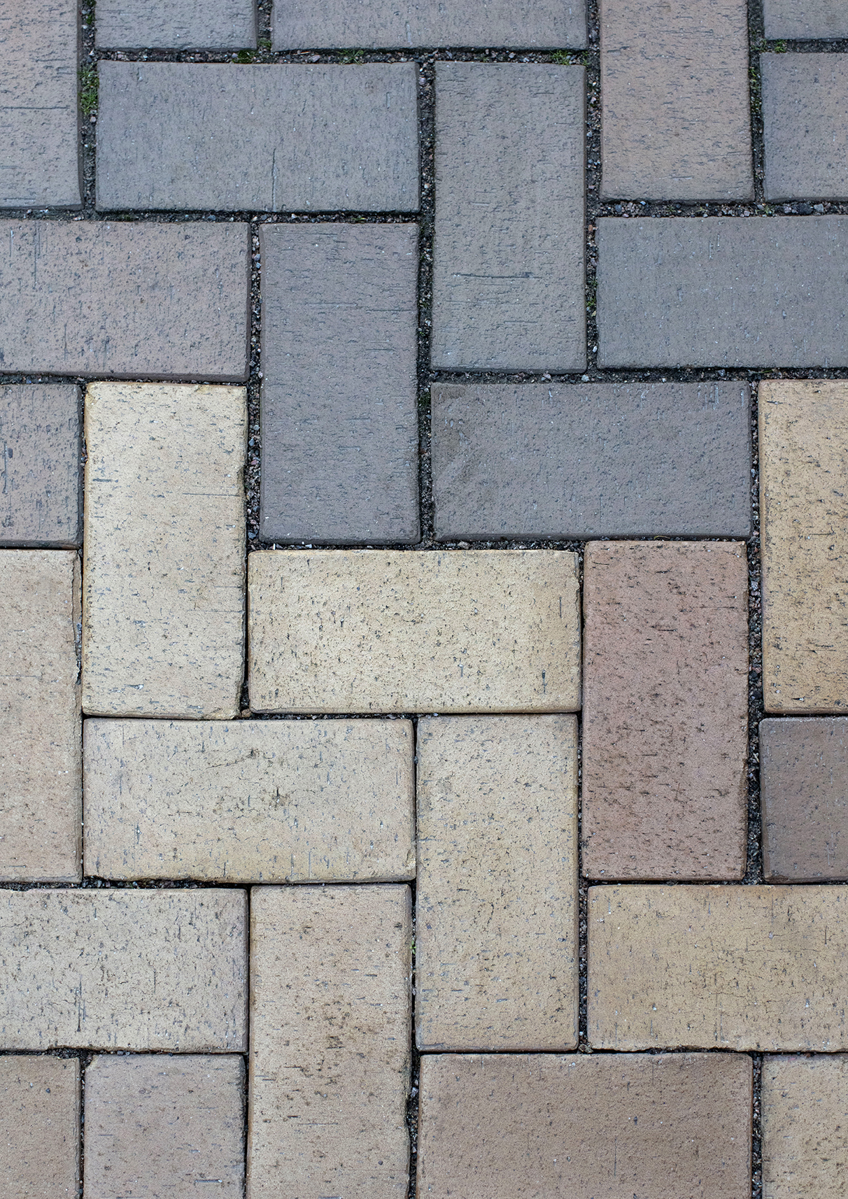 Vi har gennemtrawlet hele bykernen, Tora skal tilbage til Stadshuset til et møde, og jeg tager turen en gang mere for at fotografere fortovstegl i mange udformninger og flere nuancer af gul, rød blåviolet.