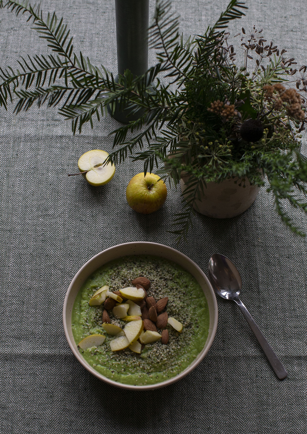 Followed by breakfast by candlelight, which is another happiness booster. I am one of the many who have embraced green energizing smoothie bowls. I do not use any particular recipe but blend a little water, a dash of olive oil, a banana and half a lemon with whatever I find in the vegetable drawer. Generally, I am a big fan of breakfast. So big a fan, in fact, that for the next bookazine, which is about colours, I have photographed colourful breakfast smoothies in many different versions in combination with beautiful hand-crafted tableware.