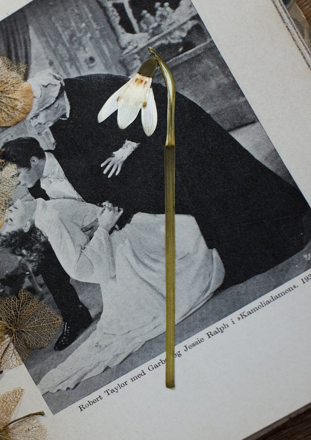 “Jeg ved ikke, hvor jeg har bogen fra”, siger Gry, “den handler om filmhistorie. Jeg havde helt ærligt ikke skænket dens skønhed nogen opmærksomhed, før jeg var på barsel med mit fjerde drengebarn i 2018. Men der er noget særligt med denne her bog; min far var gartner, og da jeg var barn, pressede vi altid blomster i gamle bøger. Det gør jeg også med mine drenge. Da jeg fandt bogen frem for at læse i den, var den fyldt med pressede blomster. Jeg havde selv placeret dem, og dog var blomsterne som en hilsen fra min barndom.”