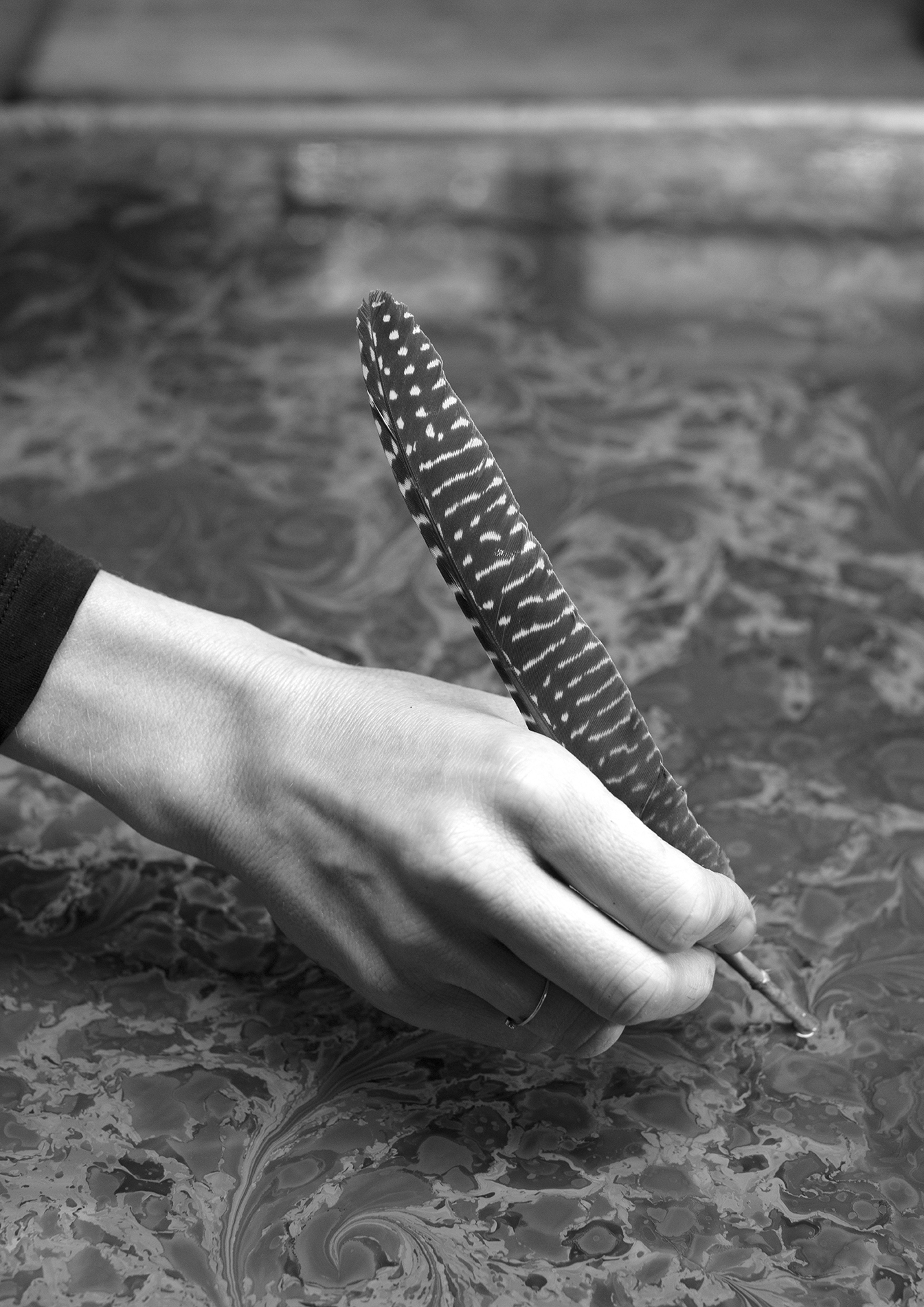“Jeg holder pause fra filmbranchen, men ikke pause fra at være kreativ. Jeg har et stort behov for at udtrykke mig, og jeg var nok på udkig efter et udtryk, som kunne forenes med mine familiære omstændigheder, da jeg blev fortryllet af det marmorerede bogomslags skønhed. Jeg begyndte at følge profiler på Instagram, som marmorerer, og jeg gik selv i gang med at udforske teknikken. Processen minder på en måde om at gå i mørkekammeret.