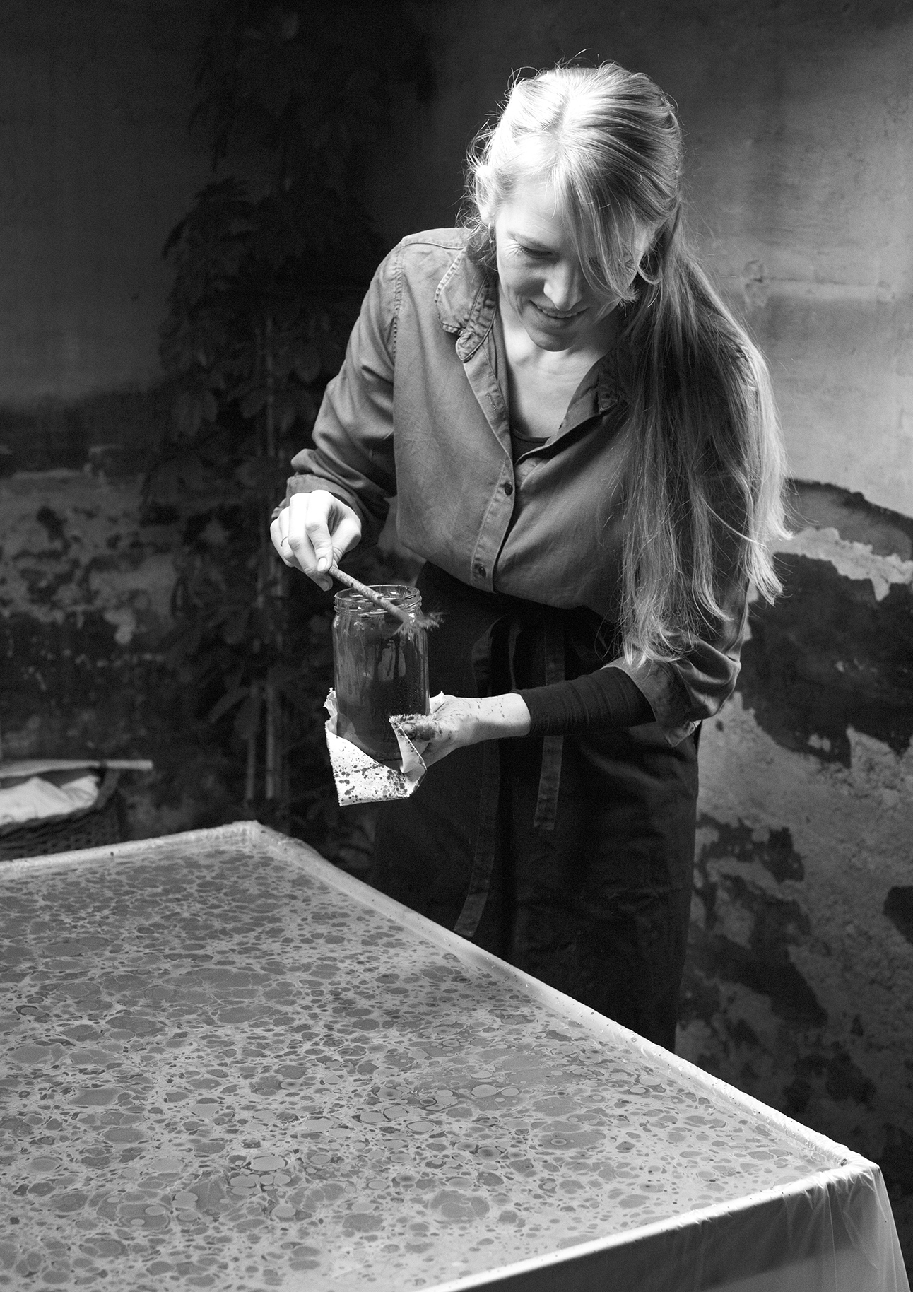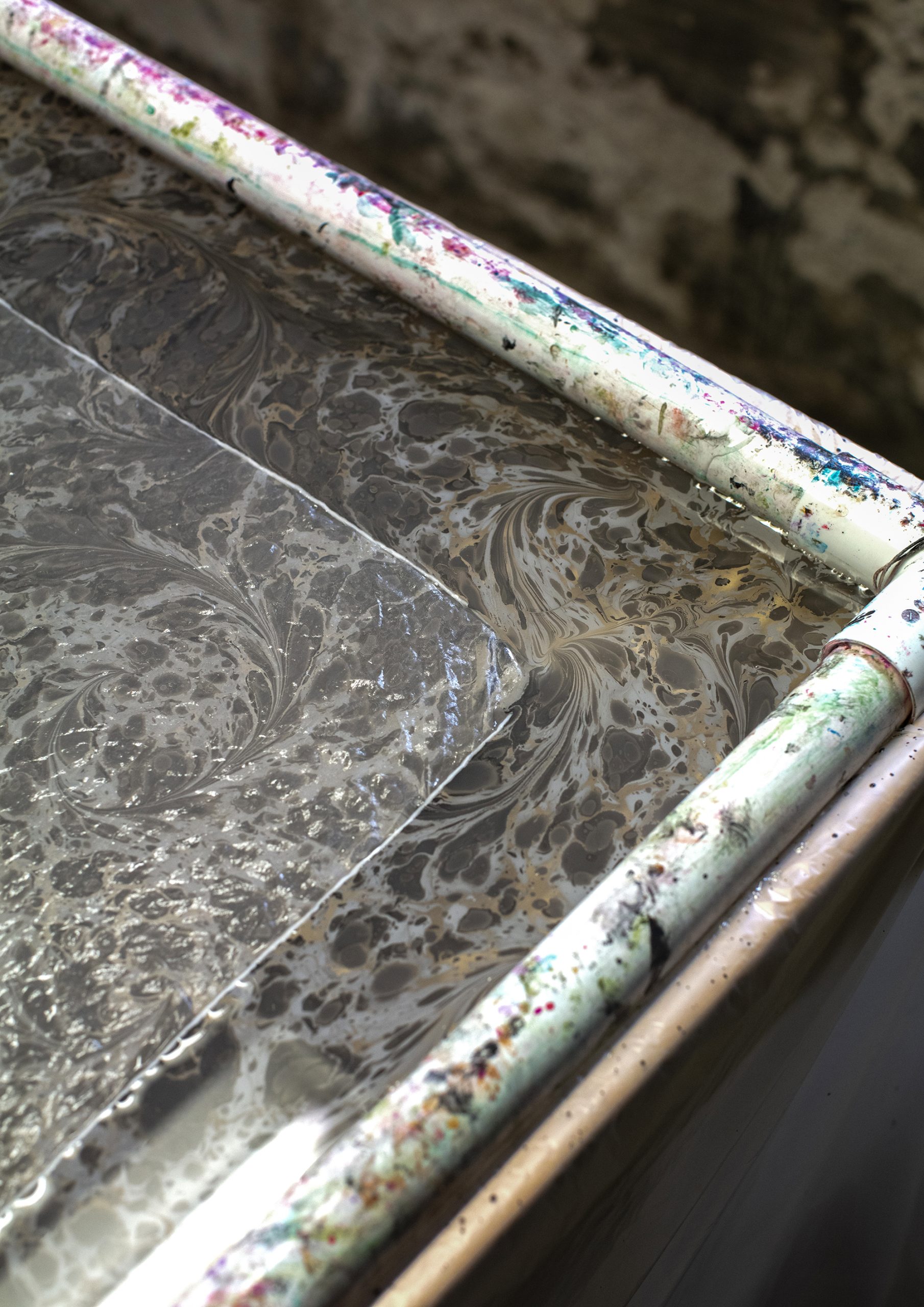 On the table in Gry’s studio is an old book bound in marbled paper. Bookbinding is the most common medium for marbling. Like so many other craft disciplines, marbling had all but disappeared but is now being rediscovered and finding new modes and expressions.