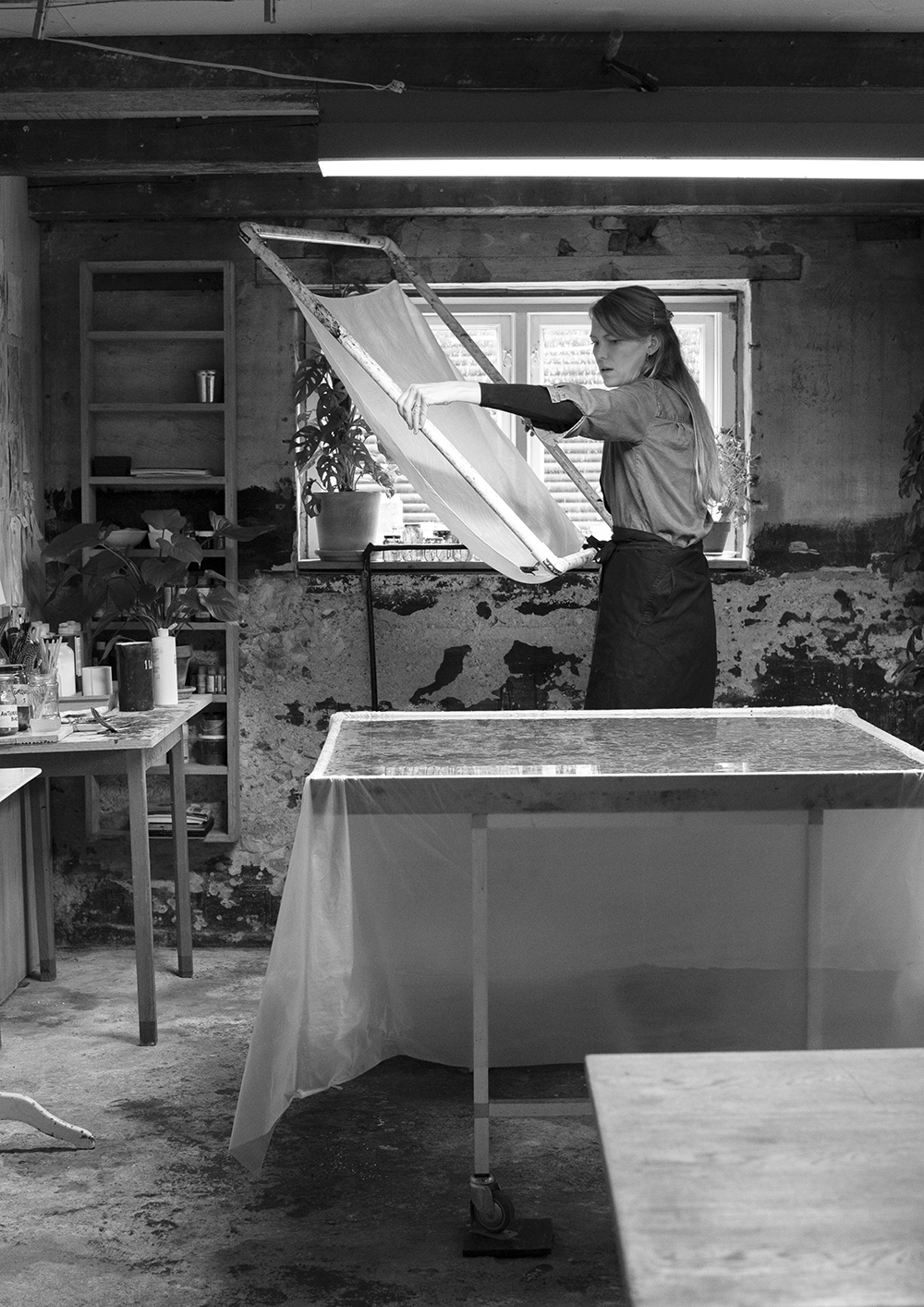 ‘This one is going to be great,’ says Gry, visibly excited with the outcome, and explains, ‘Where the dye is thicker, you can use a feather to make swirls.’ She does so, and a beautiful pattern emerges. Now the frame with the textile is lowered onto the surface. The fabric picks up the colour, rests a moment to allow the colour to settle and is then pulled off in a single movement.