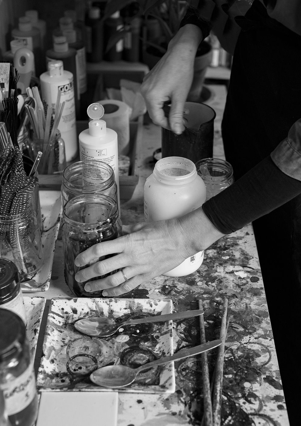 “Kirsten ved alt”, fortæller Gry, “og hun deler beredvilligt ud af sin viden. Ikke at hun selv har marmoreret, men hun kan materialerne, og jeg er selv ret systematisk og stædig, hvis først noget tænder mig. I to år testede jeg, registrerede, noterede og testede mere, indimellem har Kirsten stået der med sparring og råd. Nu kan jeg, jeg har helt styr på min farve og min teknik. Det giver mig en enorm frihed til at gribe øjeblikkets tilfældigheder,når grundforudsætningerne er på plads.”
