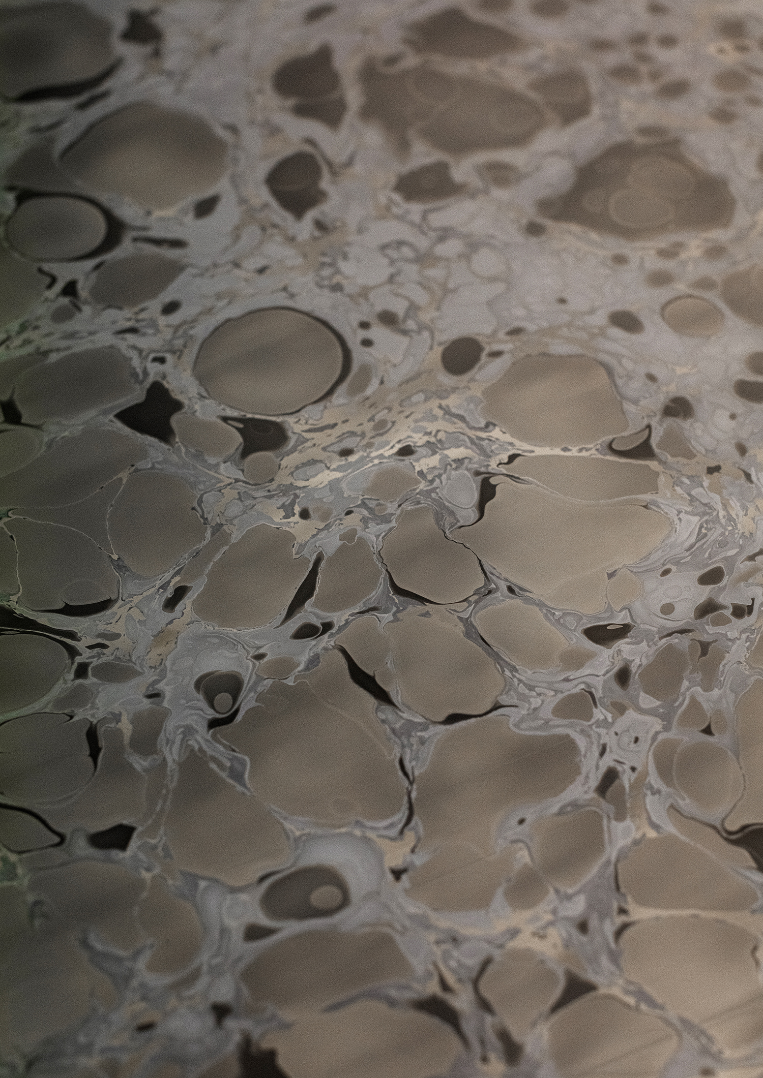 På bordet i Grys arbejdsrum ligger der en gammel bog indbundet i marmoreret papir. Det er i bogbinderfaget, man oftest støder på marmorering, eller stødte på. Som med så mange andre håndværksdiscipliner har ‘marbling’ været næsten forsvundet og bliver nu genopdaget og finder nye veje og udtryk.