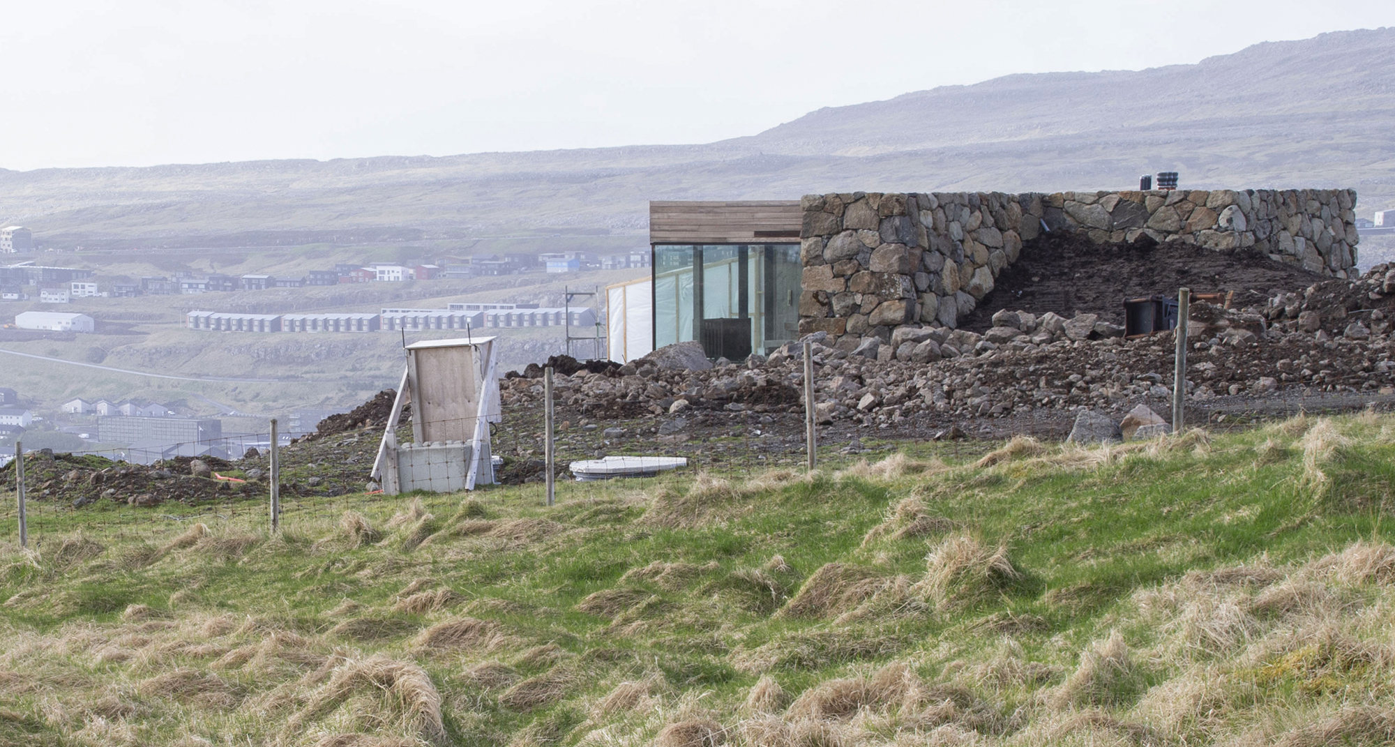 Bygningen, som er opført i store, rå sten og træ, har første parket til både Tórshavns havnefront og den lille ø Nólsoy.