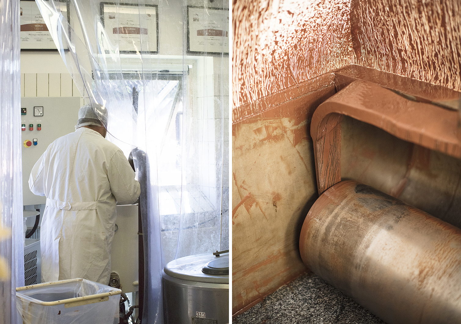 Jeg kanter mig rundt i produktionslokalet, hvor luften er tung og fedtet af kakaosmør og den duftmættede produktionsproces. Under ”concheringen” iltes chokolademassen ved hjælp af langsom omrøring ved høj temperatur. På den måde forsvinder noget af den naturlige eddikesyre til fordel for en mere blød og afbalanceret duft og smag. Da processen startes op, kan man dufte eddiken, nogle timer efter er duften allerede helt anderledes afrundet. ”Man har sjældent set et produkt blive bedre af at blive fremstillet hurtigere, sådan er det også med chokoladen. Det tager den tid det tager, og den tid har vi her. En konventionel chokolade tager otte timer at lave fra start til slut. Vores tager seks dage, hvis vi skynder os” fortæller Mikkel.